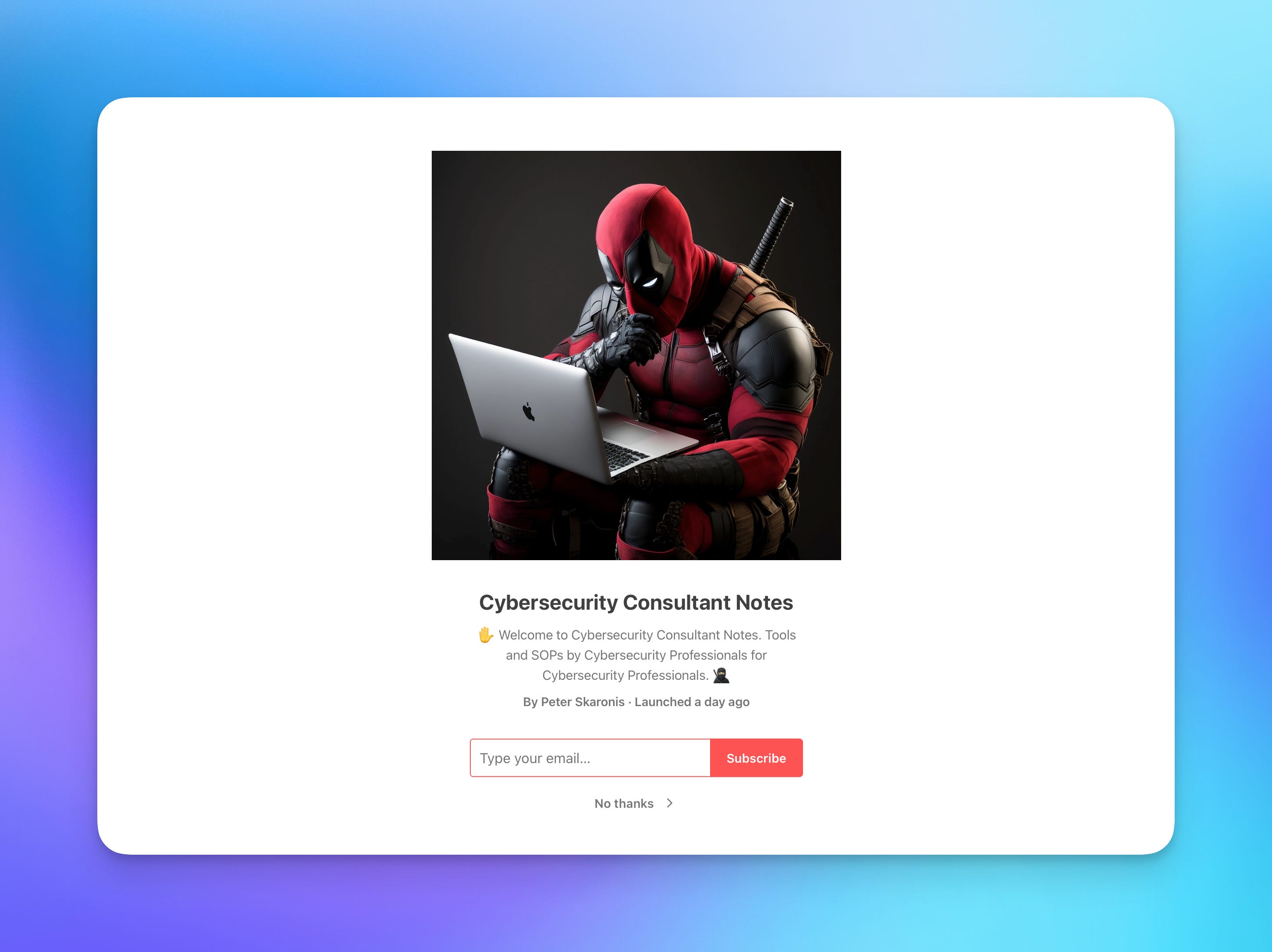 It's called Cybersecurity Consultant Notes. I've set up the site initially on Ghost but now moved to substack. I will be starting with free and subscriber only content and will be looking to add premium content for a monthly or yearly subscription.